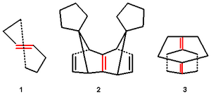In alkenes 1.2 and 1.3 these angles are determined with X-ray crystallography as respectively 32.4°/22.7° and 27.3°/35.6°. Although stable, these alkenes are very reactive compared to ordinary alkenes. They are liable to dimerization creating cyclobutane rings, or react with oxygen to epoxides.