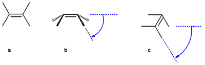 The pyramidalization angle φ (b) is defined as the angle between the plane defined by one of the doubly bonded carbons and its two substituents and the extension of the double bond and is calculated as: