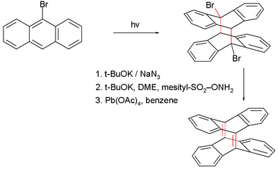 The compound tetradehydrodianthracene, also with a 35° pyramidalization angle, is synthesized in a photochemical cycloaddition of bromoanthracene followed by elimination of hydrogen bromide.
