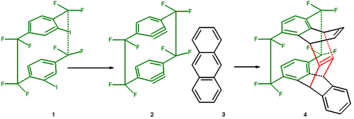 In one study,[3] the strained alkene 4.4 was synthesized with the highest pyramidalizion angles yet, 33.5° and 34.3°. This compound is the double Diels–Alder adduct of the diiodocyclophane 4.1 and anthracene 4.3 by reaction in presence of potassium tert-butoxide in refluxing dibutyl ether through a diaryne intermediate 4.2. This is a stable compound but will slowly react with oxygen to an epoxide when left standing as a chloroform solution.