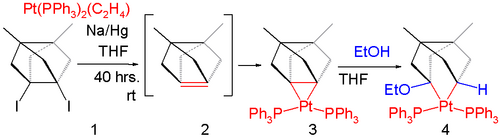 A reaction of the diiodide 5.1 in Figure 5 with sodium amalgam in the presence of ethylenebis(triphenylphosphine)platinum(0) does not give the intermediate alkene 5.2 but the platinum stabilized 5.3. The sigma bond in this compound is destroyed in reaction with ethanol.