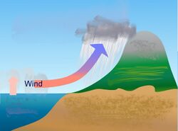 Orographic or relief rainfall is caused when masses of air are forced up the side of elevated land formations, such as large mountains or plateaus (often referred to as an upslope effect). The lift of the air up the side of the mountain results in adiabatic cooling with altitude, and ultimately condensation and precipitation. In mountainous parts of the world subjected to relatively consistent winds (for example, the trade winds), a more moist climate usually prevails on the windward side of a mountain than on the leeward (downwind) side, as wind carries moist air masses and orographic precipitation. Moisture is precipitated and removed by orographic lift, leaving drier air (see Foehn) on the descending (generally warming), leeward side where a rain shadow is observed.[6]