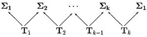 Melbourne, Chossat, and Golubitsky (1989), describe a method for finding heteroclinic cycles in symmetric systems of differential equations. Let \(\Gamma\subset O(N)\) be a Lie subgroup (where \(O(N)\) denotes the orthogonal group of order \(N\)) and let \(g:\R^N\to\R^N\) be \(\Gamma\)-equivariant, that is, \[ g(\gamma X)=\gamma g(X), \] for all \(\gamma \in \Gamma\ .\) Consider the system \[ \frac{dX}{dt}=g(X). \] Note that \(N=kn\) in an \(n\)-cell system with \(k\) state variables in each cell. Equivariance of \(g\) implies that whenever \(X(t)\) is a solution, so is \(\gamma X(t)\ .\) Using fixed-point subspaces, Melbourne et al. (1989) suggest a method for constructing heteroclinic cycles connecting equilibria. Suppose that \(\Sigma\subset\Gamma\) is a subgroup. Then the fixed-point subspace \[ \mbox{Fix}(\Sigma)=\{X\in\R^N: \sigma X=X \quad\forall \sigma\in\Sigma\} \] is a flow invariant subspace. The idea is to find a sequence of maximal subgroups \(\Sigma_j\subset\Gamma\) such that \(\dim \mbox{Fix}(\Sigma_j)=1\) and submaximal subgroups \(T_j\subset\Sigma_j\cap\Sigma_{j+1}\) such that \(\dim \mbox{Fix}(T_j)=2\ ,\) as is shown schematically in Figure 1. In addition, the equilibrium in \(\mbox{Fix}(\Sigma_j)\) must be a saddle in \(\mbox{Fix}(T_j)\) whereas the equilibrium in \(\mbox{Fix}(\Sigma_{j+1})\) must be a sink in \(\mbox{Fix}(T_j)\ .\)