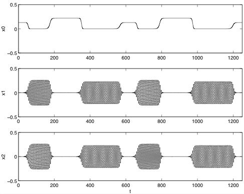 In related work that describes cycling chaos, Dellnitz et al. (1995) point out that the Guckenheimer-Holmes system can be interpreted as a coupled cell system (with three cells) in which the internal dynamics of each cell is governed by a pitchfork bifurcation of the form \[ \dot{x}_i = \mu x_i - a x_i^3, \] where \(i=1,2,3\) is the cell number. As \(\mu\) varies from negative to positive through zero, a bifurcation from the trivial equilibrium \(x_i=0\) to nontrivial equilibria \(x_i= \pm \sqrt{\mu}\) occurs. Guckenheimer and Holmes (1988) show that when the strength of the remaining terms in the system of ODE's (which can be interpreted as coupling terms) is large, an asymptotically stable heteroclinic cycle connecting these bifurcated equilibria exists. The connection between the equilibria in cell one to the equilibria in cell two occurs through a saddle-sink connection in the \(x_1 x_2-\)plane (which is forced by the internal symmetry of the cells to be an invariant plane for the dynamics). As Dellnitz et al. (1995) further indicate, the global permutation symmetry of the three-cell system guarantees connections in both the \(x_2 x_3-\)plane and the \(x_3 x_1-\)plane, leading to a heteroclinic connection between three equilibrium solutions. The Figure below shows the time-dependent trajectory of each of the individual cells or variables of the Guckenheimer-Holmes system. Observe that, as time evolves, all three trajectories spend longer periods of time near each equilibrium, as expected.