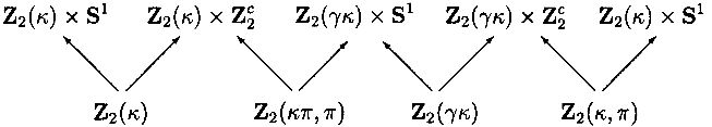 Consider for instance a system of differential equations with the symmetries of a hexagon, which are described by the dihedral group \(D_6\ .\) Reflectional symmetries of a hexagon come in two (nonconjugate) types: those whose line of reflection connects opposite vertices of the hexagon (\(\kappa\)) and those whose line of symmetry connects midpoints of opposite sides (\(\gamma\kappa\)). It is known that \(D_6\) symmetry-breaking steady-state bifurcations produce two nontrivial equilibria --- one with each type of reflectional symmetry --- and \(D_6\) symmetry-breaking Hopf bifurcations produce two standing waves --- one with each type of reflectional symmetry. In normal form the symmetry groups of these four solutions are \(Z_2(\kappa)\times S^1\ ,\) \(Z_2(\gamma\kappa)\times S^1\ ,\) \(Z_2(\kappa)\times Z_2^c\ ,\) and \(Z_2(\gamma\kappa)\times Z_2^c\) where \(Z_2^c=Z_2(\pi,\pi)\ .\) Using the ideas described by Melbourne et al. (1989), the Figure below suggests that robust, asymptotically stable heteroclinic cycles can appear in unfoldings of \(D_6\) normal form symmetry-breaking steady-state/Hopf mode interactions.