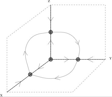 Note that, in fact, this is a homoclinic cycle since the three equilibria are on the group orbit given by the cyclic generator of order 3. The actual system of ODE's can be written in the following form \[ \begin{matrix} \dot{x}_1 &=& \mu x_1 - (a x_1^2+b x_2^2+ cx_3^2)x_1 \\ \dot{x}_2 &=& \mu x_2 - (a x_2^2+b x_3^2+ cx_1^2)x_2 \\ \dot{x}_3 &=& \mu x_3 - (a x_3^2+b x_1^2+ cx_2^2)x_3\;. \end{matrix} \]