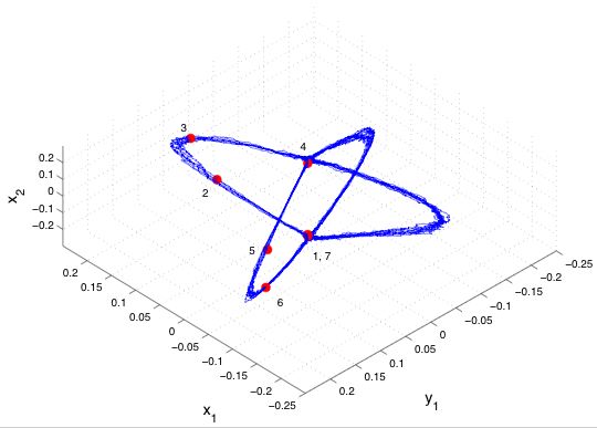 A generic example of a cellular-pattern-forming dynamical system is described by the Kuramoto-Sivashinsky (KS) equation, which can be written in the form \[ {\partial u \over \partial t} = \eta_{1} u - (1+\nabla^2)^2 u - \eta_{2} (\nabla u)^2 - \eta_{3} u^3 + \xi(\vec{x},t), \] where \(u=u(\vec{x},t)\) represents the perturbation of a planar front (normally assumed to be a flame front) in the direction of propagation, \(\eta_{1}\) measures the strength of the perturbation force, \(\eta_{2}\) is a parameter associated with growth in the direction normal to the domain (burner) of the front, \(\eta_{3} u^3\) is a term that has been added to help stabilize its numerical integration, and \(\xi(\vec{x},t)\) represents Gaussian white noise, which models thermal fluctuations, dimensionless in space and time. The KS equation describes the perturbations of a uniform wave front by thermo-diffusive instabilities. It has been studied in different contexts, including the existence of heteroclinic connections, by Cross and Hohenberg (1993), Armbruster, Guckenheimer, and Holmes (1988), Holmes, Lumley, and Berkooz (1996), and by Hyman and Nicolaenko (1986). Gassner, Blomgren, and Palacios (2007) have also conducted numerical explorations of the effects of noise on the KS equation in various regions of parameter space. The figure below shows a phase-space diagram of a low-dimensional system of ODE's derived from the KS equation in a region of parameter space where a heteroclinic cycle exists near a 1:2 mode interaction.