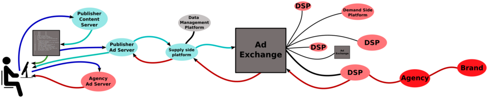 The ad exchange then passes the link to the ad back through the supply side platform and the publisher's ad server to the user's browser, which then requests the ad content from the agency's ad server. The ad agency can thus confirm that the ad was delivered to the browser.[55]