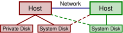 In an OpenVMS cluster configuration, non-private disks are shared between all nodes in the cluster (see figure 1). In this configuration, the two system disks are accessible to both nodes via the network, but the private disk is not shared: it is mounted for use only by a particular user or process on that machine. Access to files across a cluster is managed by the OpenVMS Distributed Lock Manager, an integral part of the file system.