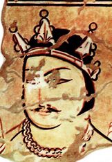 The influence of Chinese art started to appear in the eastern part of the Tarim Basin, as Buddhist art was spreading eastward. These Chinese characteristics appear in the art of the Bezeklik Caves or the Dunhuang Caves.