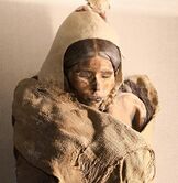 The Pazyryk culture is a Scythian[15] nomadic Iron Age archaeological culture (of Iranian origin; c. 6th to 3rd centuries BC) identified by excavated artifacts and mummified humans found in the Siberian permafrost, in the Altay Mountains, Kazakhstan and nearby Mongolia. The mummies are buried in long barrows (or kurgans) similar to the tomb mounds of Scythian culture in Ukraine . The type site are the Pazyryk burials of the Ukok Plateau.[16] Many artifacts and human remains have been found at this location, including the Siberian Ice Princess, indicating a flourishing culture at this location that benefited from the many trade routes and caravans of merchants passing through the area.[17] The Pazyryk are considered to have had a war-like life.[18]