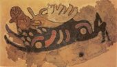 Certain geometric designs and sun symbols, such as the circle and rosette, recur at Pazyryk but are completely outnumbered by animal motifs. The stag and its relatives figure as prominently as in Altai-Sayan. Combat scenes between carnivores and herbivores are exceedingly numerous in Pazyryk work; the Pazyryk beasts are locked in such bitter fights that the victim's hindquarters become inverted.[19]