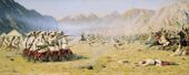 The Emir of Bukhara and the notables of the city watch how the heads of Russian soldiers are impaled on poles. Samarkand