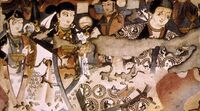 The Hepthalites appears in several mural paintings in the area of Tokharistan, especially in banquet scenes at Balalyk tepe and as donors to the Buddha in the ceiling painting of the 35 meter Buddha at the Buddhas of Bamiyan.[95] Several of the figures in these paintings have a characteristic appearance, with belted jackets with a unique lapel of their tunic being folded on the right side, a style which became popular under the Hephthalites,[96] the cropped hair, the hair accessories, their distinctive physionomy and their round beardless faces.[97][98] The figures at Bamiyan must represent the donors and potentates who supported the building of the monumental giant Buddha.[97] These remarkable paintings participate "to the artistic tradition of the Hephthalite ruling classes of Tukharistan".[95][99]