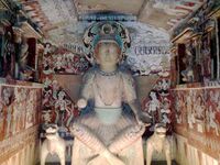 Figure of Maitreya Buddha in cave 275 from Northern Liang (397–439), one of the earliest caves. The crossed ankle figure with a three-disk crown shows influence from Kushan art. Mogao Caves