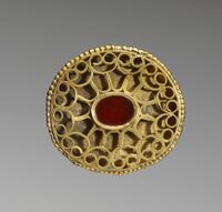 Both ancient sources and archaeological finds from graves confirm that the Huns wore elaborately decorated golden or gold-plated diadems.[72] Maenchen-Helfen lists a total of six known Hunnish diadems.[73] Hunnic women seem to have worn necklaces and bracelets of mostly imported beads of various materials as well.[74] The later common early medieval practice of decorating jewelry and weapons with gemstones appears to have originated with the Huns.[75] They are also known to have made small mirrors of an originally Chinese type, which often appear to have been intentionally broken when placed into a grave.[76]