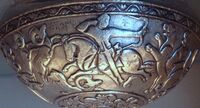 Possible Kushano-Sasanian plate, excavated in Rawalpindi, Pakistan , 350-400 CE.[64] British Museum 124093.[65][66]