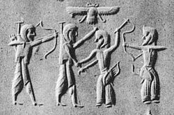 Stamp seal with a bearded figure in Sasanian dress, wearing the kulāf denoting nobility and officials; and a figure with radiate crown,[106] both with royal ribbons. Attributed to the Hephthalites,[107] and recently dated to the 5th-6th century CE.[108] Stamp seal (BM 119999), British Museum.