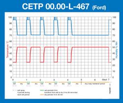Taking results gathered largely from ‘real world’ exposure sites, automotive companies, led originally by the Japanese automobile industry, developed their own Cyclic Corrosion Tests. These have evolved in different ways for different vehicle manufacturers, and such tests still remain largely industry specific, with no truly international CCT standard. However, they all generally require most of the following conditions to be created, in a repeating sequence or ‘cycle’, though not necessarily in the following order:[2]