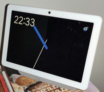 Nest Hub Max with a camera, displaying a clock screensaver.