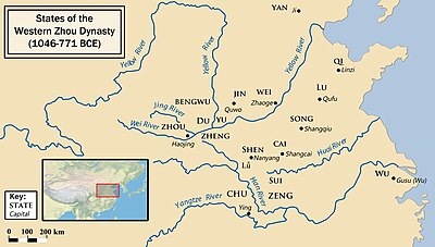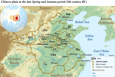 On the periphery, the states of Yan, Qi (齊), and Jin in the north and northeast had more room to expand and grew into large states.[4] In the southwest the non-Zhou state of Chu (楚) demanded attention. In the southeast, the Zhou confederation was bordered by the peoples of Wu (吳) and Yue (越). These polities and cultural outgroups in the Yangtze River valley were not fully incorporated into a centralised political domain until the imperial era.[5] Around the borders of the Central States (中國) lived "barbarians", fenced off from the Zhou heartlands by their enfeoffed regional lords. Apart from their responsibilities to the throne, the regional lords were responsible for their families, their people, and the altars of soil and grain outside their cities, where annual sacrifices were performed.