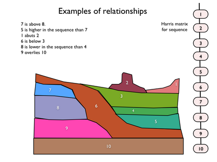 An archaeological relationship is the position in space and by implication, in time, of an object or context with respect to another. This is determined, not by linear measurement but by determining the sequence of their deposition – which arrived before the other. The key to this is stratigraphy.