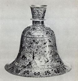 The bell-shaped vessel was described as being about 4.5 inches (11 cm) high, 6.5 inches (17 cm) in diameter at the base and 2.5 inches (6.4 cm) in diameter at the top. The body of this object was said to resemble zinc alloyed with silver in color. Its description said that "On the sides there are six figures of a flower, or bouquet, beautifully inlaid with pure silver, and around the lower part of the vessel a vine, or wreath, inlaid also with silver."[1] The primary source[1] of information about this object, provides neither any picture of nor age estimate for the Dorchester Pot.