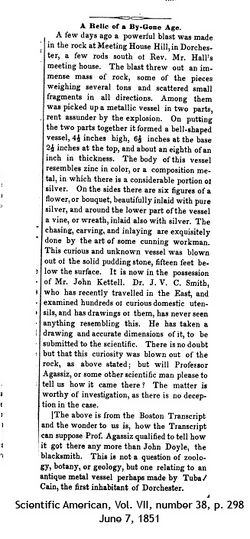 The Dorchester Pot was a metal vase-like object that was recovered in two pieces after an explosion used to break up rock at Meeting House Hill, in Dorchester, Massachusetts in 1851. According to text reprinted from the Boston Transcript, a local paper, in the June 5, 1852 Scientific American,[1] the two pieces were found, loose among debris thrown out by the explosion. Apparently, it was inferred from the locations of the two pieces of this pot among the explosion debris that this pot had been blasted from solid puddingstone (conglomerate), which is part of the Roxbury Conglomerate, from about 10 feet below the surface[2] of Meeting House Hill. The story has been used by creationists and fringe theorists as evidence that conventional models of geology or the length of the human presence on earth are wrong. Mainstream commentators identify it as a Victorian era candlestick or pipe holder.