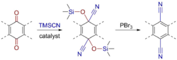 - Cyanide ions facilitate the coupling of dibromides. Reaction of α,α′-dibromoadipic acid with sodium cyanide in ethanol yields the cyano cyclobutane:[18]