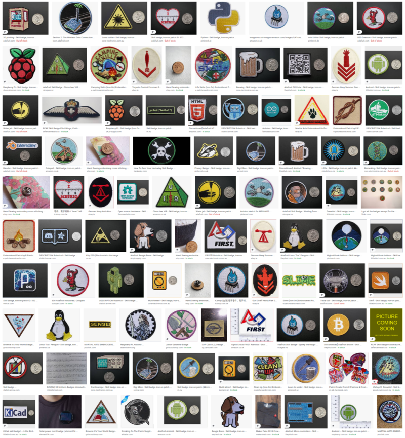 Badges can be used to document an achievement in various educational and learning contexts. Adafruit sells a variety of maker skill patches. The following pictures were made by Adafruit and found in their Skill Badges album on Flickr (retrieved August 2019].