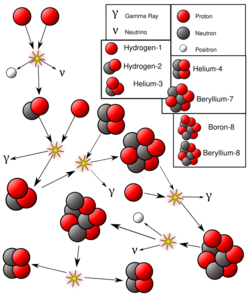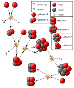 The proton–proton chain, also commonly referred to as the p-p chain, is one of two known sets of nuclear fusion reactions by which stars convert hydrogen to helium. It dominates in stars with masses less than or equal to that of the Sun,[2] whereas the CNO cycle, the other known reaction, is suggested by theoretical models to dominate in stars with masses greater than about 1.3 times that of the Sun.[3]
