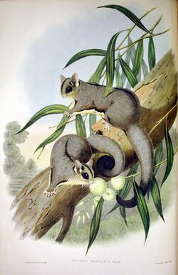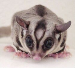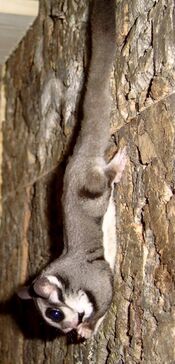 The sugar glider (Petaurus breviceps) is a small, omnivorous, arboreal, and nocturnal gliding possum. The common name refers to its predilection for sugary foods such as sap and nectar and its ability to glide through the air, much like a flying squirrel.[7] They have very similar habits and appearance to the flying squirrel, despite not being closely related—an example of convergent evolution.[8] The scientific name, Petaurus breviceps, translates from Latin as "short-headed rope-dancer", a reference to their canopy acrobatics.[9]