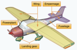 The structural parts of a fixed-wing aircraft are called the airframe. The parts present can vary according to the aircraft's type and purpose. Early types were usually made of wood with fabric wing surfaces, When engines became available for powered flight around a hundred years ago, their mounts were made of metal. Then as speeds increased more and more parts became metal until by the end of WWII all-metal aircraft were common. In modern times, increasing use of composite materials has been made.