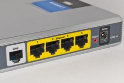 A typical home or small office router showing the ADSL telephone line and Ethernet network cable connections