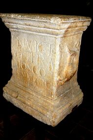 From the 5th century BCE onwards, the brothers were revered by the Romans, probably as the result of cultural transmission via the Greek colonies of Magna Graecia in southern Italy. An archaic Latin inscription of the 6th or 5th century BCE found at Lavinium, which reads Castorei Podlouqueique qurois ("To Castor and Pollux, the Dioskouroi"), suggests a direct transmission from the Greeks; the word "qurois" is virtually a transliteration of the Greek word κούροις, while "Podlouquei" is effectively a transliteration of the Greek Πολυδεύκης.[36] The construction of the Temple of Castor and Pollux, located in the Roman Forum at the heart of their city, was undertaken to fulfill a vow (votum) made by Aulus Postumius Albus Regillensis in gratitude at the Roman victory in the Battle of Lake Regillus in 495 BCE. The establishment of a temple may also be a form of evocatio, the transferral of a tutelary deity from a defeated town to Rome, where cult would be offered in exchange for favor.[37] According to legend, the twins fought at the head of the Roman army and subsequently brought news of the victory back to Rome.[13] The Locrians of Magna Graecia had attributed their success at a legendary battle on the banks of the Sagras to the intervention of the Twins. The Roman legend could have had its origins in the Locrian account and possibly supplies further evidence of cultural transmission between Rome and Magna Graecia.[38]