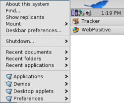 The Deskbar is a taskbar that is by default placed in the upper right corner of the screen of the Haiku operating system. It is composed of the deskbar menu, the tray (clock information panel) and the list of running programs. The Tracker is always shown on the top of the list of running programs.