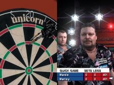A screenshot featuring Peter Manley throwing against Wayne Mardle