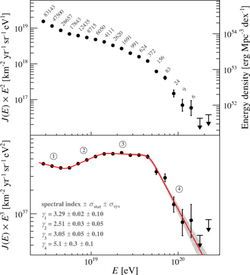 - ↑ The Pierre Auger Collaboration; Aab, A.; Abreu, P.; Aglietta, M.; Albury, J. M.; Allekotte, I.; Almela, A.; Alvarez Castillo, J. et al. (2020-09-16). "Features of the Energy Spectrum of Cosmic Rays above $2.5\ifmmode\times\else\texttimes\fi{}{10}^{18}\text{ }\text{ }\mathrm{eV}$ Using the Pierre Auger Observatory". Physical Review Letters 125 (12): 121106. doi:10.1103/PhysRevLett.125.121106. PMID 33016715. Bibcode: 2020PhRvL.125l1106A.