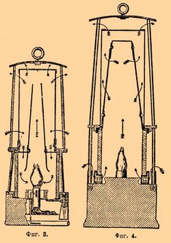 The Clifford also has a double shield, but with a plain flat top. The chimney is quite narrow with wire gauze covering the top. The bottom of the chimney has a glass bell covering the flame. The chimney is supported on a gauze shelf. Air enters through the lower part of the outer shield, through the passage and into the lamp through the inner shield. It is drawn down through the gauze, then passes the flame and ascends the chimney. At the top it leaves through gauze and the top of the double shield. The inner chimney is made of copper coated with a fusible metal: if the lamp gets too hot the metal melts and closes the air holes, extinguishing the lamp.[39]