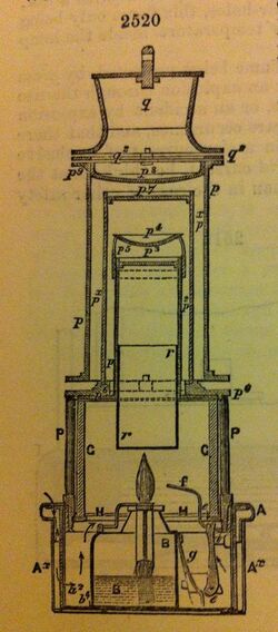 The upper portion of the lamp uses a chimney like in Mueseler and Morgan lamps. The rising gases pass up the chimney and through a gauze. At the top of the chimney a dished reflector diverts the gases out sideways through a number of holes in the chimney. The gases then start to rise up the intermediate chimney before exiting through another gauze. Gas finally passes down between the outermost chimney and the intermediate chimney, exiting a little above the glass. The outer chimney is therefore effectively a shield.[24]