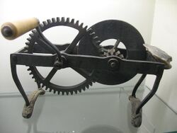 Flint and steel mills introduced by Carlisle Spedding (1696–1755) before 1733[10] had been tried with limited success.[11] An example of a Spedding steel mill may be seen in the museum at Whitehaven where Spedding was manager of the collieries of Sir James Lowther, 4th Baronet.[12] A steel disk was rotated at high speed by a crank mechanism. Pressing a flint against the disk produced a shower of sparks and dim illumination.[12] These mills were troublesome to use and were often worked by a boy, whose only task was to provide light for a group of miners. It was assumed that the sparks had insufficient energy to ignite firedamp until a series of explosions at Wallsend colliery in 1784; a further explosion in June 1785, which the operator of the mill survived, showed that ignition was possible.[13]