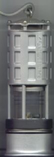 A development of the Geordie lamp was the Purdy. A galley with wire gauze provided the inlet, above the glass was a chimney with perforated copper cap and gauze outer. A brass tube protected the upper works, shielded them and kept them locked in position. A sprung pin locked the whole together.[31] The pin could only be released by applying a vacuum to a captive hollow screw; not something that a nicotine starved miner could do at the coal face .