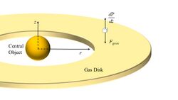 A magnetic field in a thin gas disk around a central object can change the scale height of the disk.[16][17][18] For example, if a non-perfectly conducting disk is rotating through a poloidal magnetic field (i.e., the initial magnetic field is perpendicular to the plane of the disk), then a toroidal (i.e., parallel to the disk plane) magnetic field will be produced within the disk, which will pinch and compress the disk. In this case, the gas density of the disk is:[18]