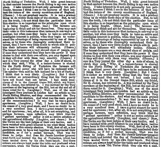 In January 1882, as Parliament was not sitting, The Times included lengthy verbatim reports from speeches given by politicians outside Parliament. On Sunday 22 January, the Attorney General Sir Henry James and Home Secretary Sir William Harcourt went to Burton upon Trent to open the St Paul's Institute, afterwards addressing speeches towards a crowd of between 7,000 and 8,000.[1] Harcourt made reference to a by-election campaign then being fought in the North Riding of Yorkshire (polling day was Thursday 26 January), in which the Liberal candidate, Samuel Rowlandson, was a tenant farmer. The Times decided to print a verbatim report of both speeches in the edition to be published on the next morning, Monday 23 January 1882.