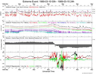 The March 1989 geomagnetic storm occurred as part of severe to extreme solar storms during early to mid March 1989, the most notable being a geomagnetic storm that struck Earth on March 13. This geomagnetic storm caused a nine-hour outage of Hydro-Québec's electricity transmission system. The onset time was exceptionally rapid.[1] Other historically significant solar storms occurred later in 1989, during a very active period of solar cycle 22.