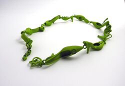 An example of 3D printed limited edition jewellery. This necklace is made of glassfiber-filled dyed nylon. It has rotating linkages that were produced in the same manufacturing step as the other parts