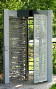 Turnstile exit-only doors are also often used in subways and other rapid transit facilities to prevent people from bypassing fare payment. They are similarly used at large sports stadiums, theme parks, and other such venues, to allow pedestrians to exit freely, but not to enter without paying admission fees. These doors usually work mechanically, with the door panels constructed of horizontal bars which pass through a "wall" of interlacing (interdigitated) bars, allowing the door leaves to pass through, but blocking people from illegally entering through the exit.
