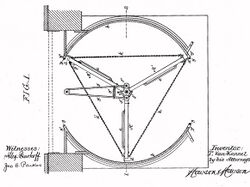 Theophilus Van Kannel, of Philadelphia, was granted US patent 387,571 on August 7, 1888, for a "Storm-Door Structure".[8] The patent drawings filed show a three-partition revolving door. The patent describes it as having "three radiating and equidistant wings ... provided with weather-strips or equivalent means to insure [sic] a snug fit". The door "possesses numerous advantages over a hinged-door structure ... it is perfectly noiseless ... effectually prevents the entrance of wind, snow, rain or dust ..." "Moreover, the door cannot be blown open by the wind ... there is no possibility of collision, and yet persons can pass both in and out at the same time." The patent further lists, "the excluding of noises of the street" as another advantage of the revolving door. It goes on to describe how a partition can be hinged so as to open to allow the passage of long objects through the revolving door. The patent itself does not use the term "revolving door".[9] An urban legend, dating back to perhaps 2008, claims that the invention was motivated by his phobia of opening doors for others, especially women; according to Snopes, there is no evidence that this claim is true.[10]
