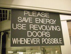 Airflows and energy losses through revolving doors also occur as a result of leakages past the seals of the door. Leakages are common to any type of opening in an otherwise closed space, but have been investigated in the context of revolving doors by Zmeureanu et al.[22] and by Schutrum et al.[16] before that. The first study concluded that to avoid significant leakages, the seals of the doors should be maintained and periodically replaced if needed. The second study produced design charts for estimating the leakage rate through a revolving door. Unlike the curves for estimating the transfer rate also published in this study, the curves for estimating the leakage rate are more generic. As such these design curves still form the basis of the target leakage rates for revolving doors recommended by the ASHRAE standard 90.1 in the US.[23] On May 25, 2006, an MIT Study entitled "Modifying Habits Towards Sustainability: A Study of Revolving Doors Usage on the MIT Campus" was published. In it, B. A. Cullum, Olivia Lee, Sittha Sukkasi and Dan Wesolowski concluded, "...substantial energy is saved when people use the revolving doors instead of swing doors – the smallest of habit changes contributes to energy conservation... Modification of one habit... indeed has the ability to eventually impact the environment on a global scale."