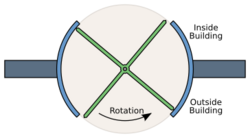 A revolving door typically consists of three or four doors that hang on a central shaft and rotate around a vertical axis within a cylindrical enclosure. Revolving doors are energy efficient as they, acting as an airlock, prevent drafts, thus decreasing the loss of heating or cooling for the building.[1] Revolving doors were designed to relieve the immense pressure caused by air rushing through high-rise buildings (referred to as stack effect pressure) while at the same time allowing large numbers of people to pass in and out.